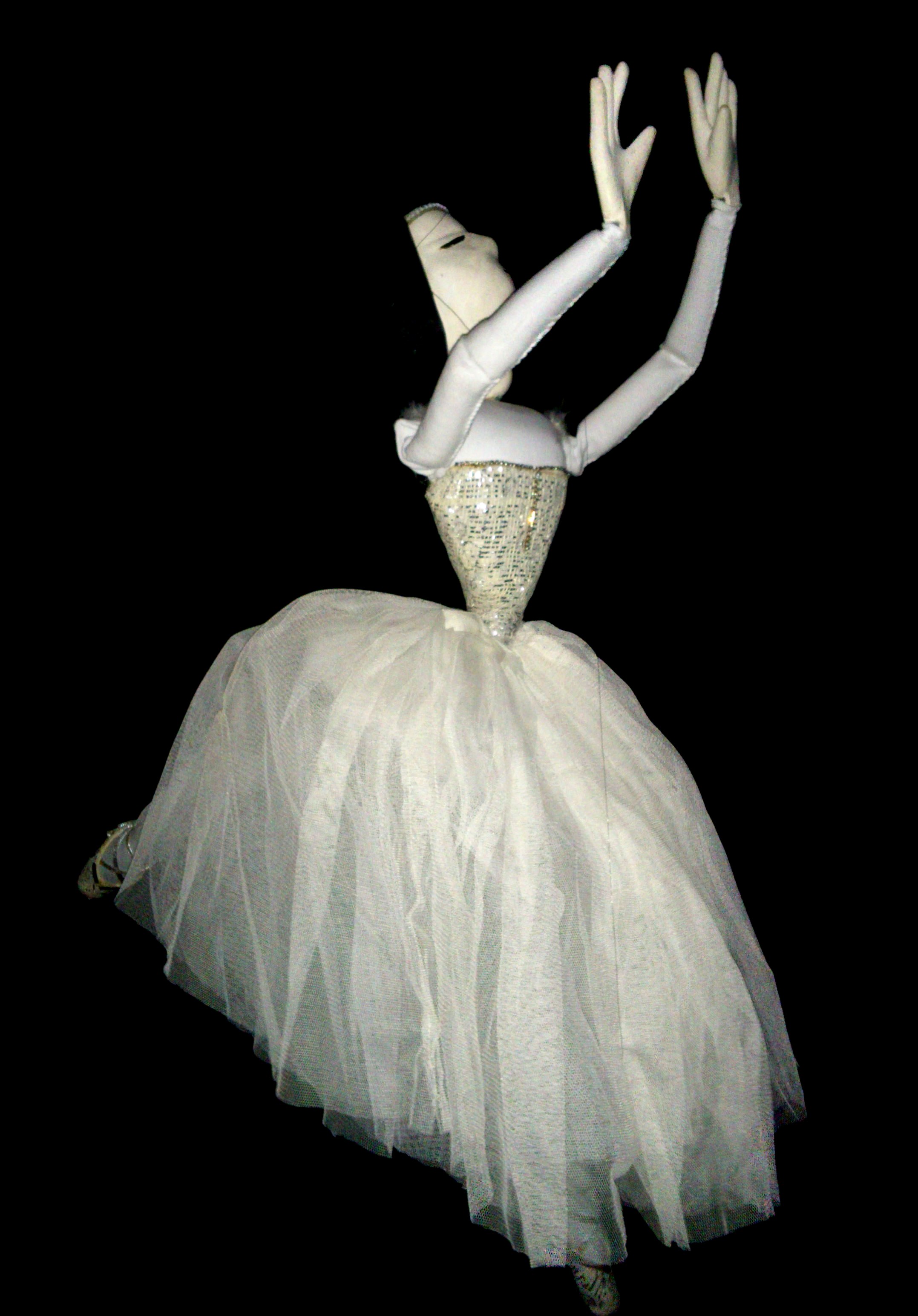 " Удивительная пластика рук этой куклы завораживает зрителя. Вдохновлённая образом Галины Улановой, эта кукла изображает "умирающего лебедя", но музыка - это знаменитая "Аве Мария", исполненная низким мужским голосом. Это контрастное сочетание нежной хрупкой женской фигуры и сильного низкого мужского голоса легло в основу этой миниатюры. Кукла одна, но мы ощущаем соприкосновение двух образов - женского, воплощённого в кукле и мужского, воплощённого в голосе. Сначала я хотел добавить Балерине партнёра, но потом понял, что эта миниатюра уже самодостаточна, и ничего лишнего здесь не нужно." - Николай Зыков, "Вокруг света с куклами"